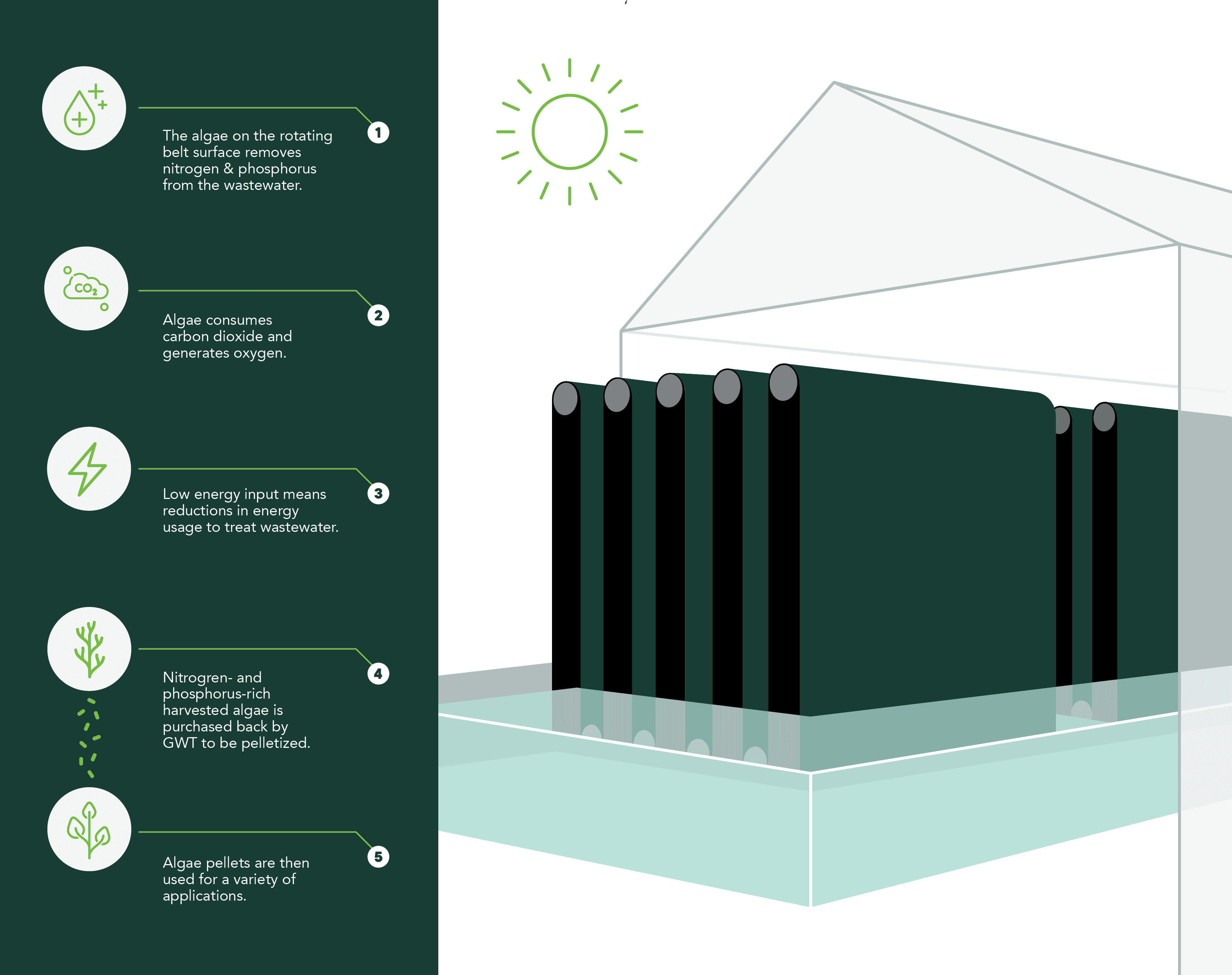 The nutrient-rich algae produced through this unique process is then harvested and purchased back by GWT to be pelletized. These algae pellets are then utilized for a variety of different applications and ensures your water’s useful byproducts do not go to waste!